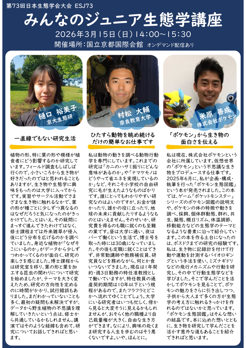 「みんなのジュニア生態学講座」は今年で11年目を迎えます。生態学に関連するアカデミア内外で大活躍中の3名に、ご自身の研究内容や仕事内容だけでなく、生態学に関わりを持ったきっかけや中学~高校の様子を語っていただきます。